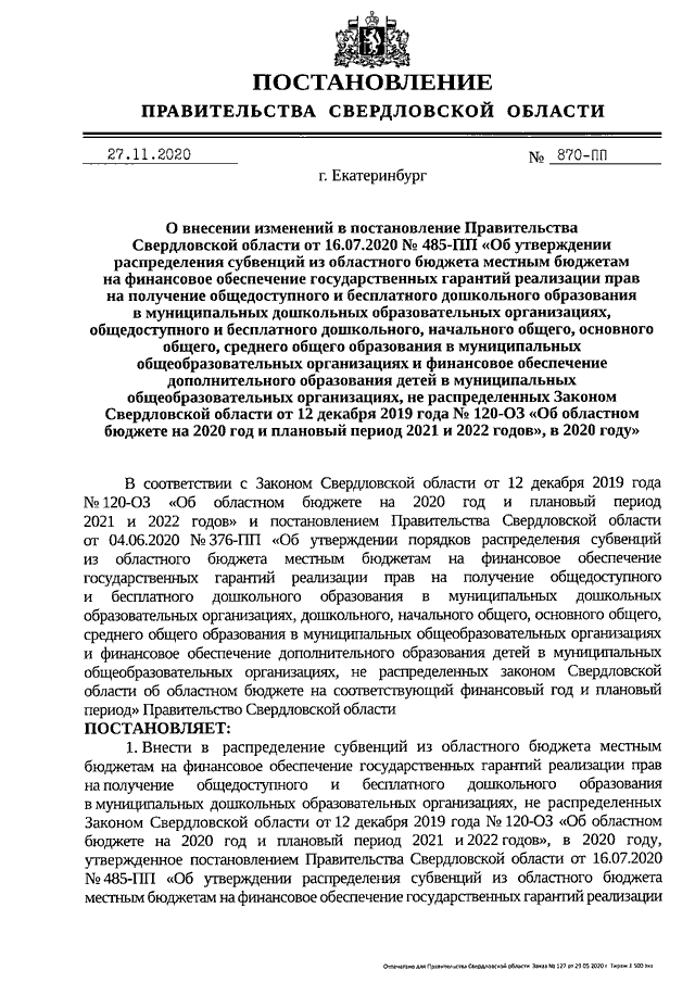 Постановление Правительства Свердловской области от 27.11.2020 N 870-ПП "О внесении изменений в постановление Правительства Свердловской области от 16.07.2020 N 485-ПП "Об утверждении распределения субвенций из областного бюджета местным бюджетам на финансовое обеспечение государственных гарантий реализации прав на получение общедоступного и бесплатного дошкольного образования в муниципальных дошкольных образовательных организациях, общедоступного и бесплатного дошкольного, начального общего, основного общего, среднего общего образования в муниципальных общеобразовательных организациях и финансовое обеспечение дополнительного образования детей в муниципальных общеобразовательных организациях, не распределенных Законом Свердловской области от 12 декабря 2019 года N 120-ОЗ "Об областном бюджете на 2020 год и плановый период 2021 и 2022 годов", в 2020 году"