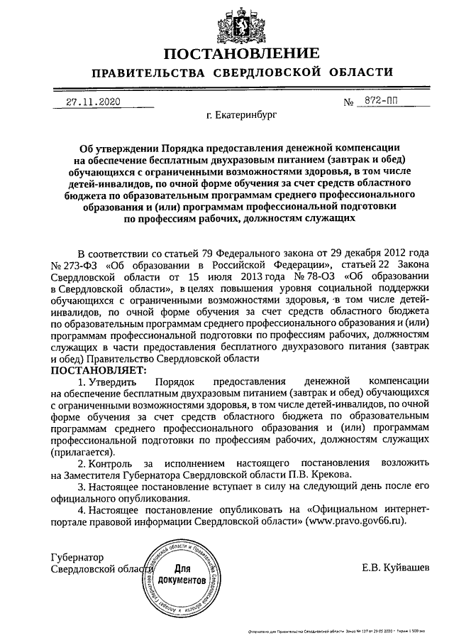Постановление Правительства Свердловской области от 27.11.2020 N 872-ПП "Об утверждении Порядка предоставления денежной компенсации на обеспечение бесплатным двухразовым питанием (завтрак и обед) обучающихся с ограниченными возможностями здоровья, в том числе детей-инвалидов, по очной форме обучения за счет средств областного бюджета по образовательным программам среднего профессионального образования и (или) программам профессиональной подготовки по профессиям рабочих, должностям служащих"