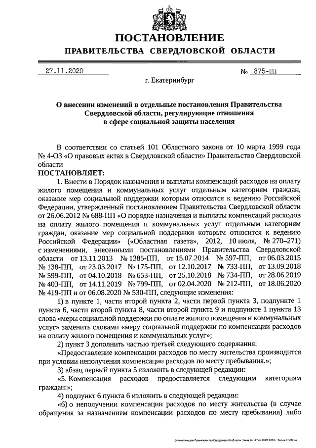 Постановление Правительства Свердловской области от 27.11.2020 N 875-ПП "О внесении изменений в отдельные постановления Правительства Свердловской области, регулирующие отношения в сфере социальной защиты населения"