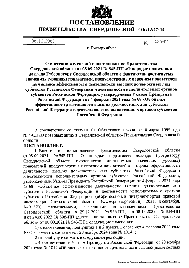 Постановление Правительства Свердловской области от 02.10.2025 N 535-ПП "О внесении изменений в Постановление Правительства Свердловской области от 08.09.2021 N 545-ПП "О порядке подготовки доклада Губернатору Свердловской области о фактически достигнутых значениях (уровнях) показателей, предусмотренных перечнем показателей для оценки эффективности деятельности высших должностных лиц субъектов Российской Федерации и деятельности исполнительных органов субъектов Российской Федерации, утвержденным Указом Президента Российской Федерации от 4 февраля 2021 года N 68 "Об оценке эффективности деятельности высших должностных лиц субъектов Российской Федерации и деятельности исполнительных органов субъектов Российской Федерации"
