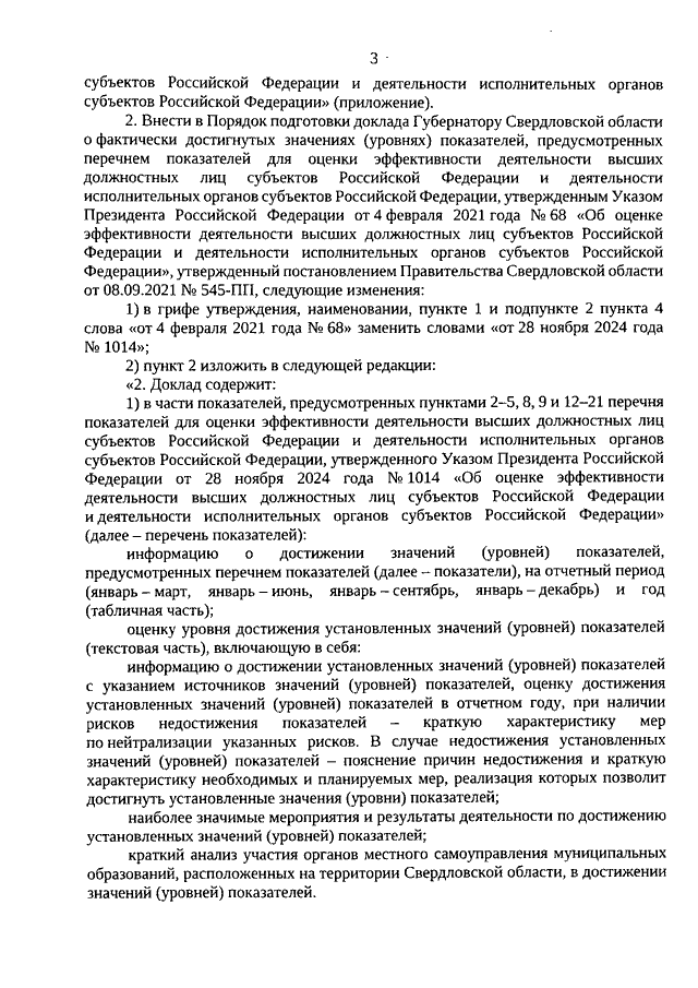 Постановление Правительства Свердловской области от 02.10.2025 N 535-ПП "О внесении изменений в Постановление Правительства Свердловской области от 08.09.2021 N 545-ПП "О порядке подготовки доклада Губернатору Свердловской области о фактически достигнутых значениях (уровнях) показателей, предусмотренных перечнем показателей для оценки эффективности деятельности высших должностных лиц субъектов Российской Федерации и деятельности исполнительных органов субъектов Российской Федерации, утвержденным Указом Президента Российской Федерации от 4 февраля 2021 года N 68 "Об оценке эффективности деятельности высших должностных лиц субъектов Российской Федерации и деятельности исполнительных органов субъектов Российской Федерации"