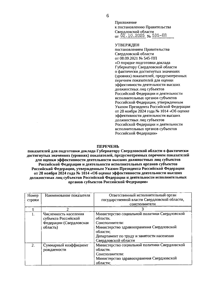 Постановление Правительства Свердловской области от 02.10.2025 N 535-ПП "О внесении изменений в Постановление Правительства Свердловской области от 08.09.2021 N 545-ПП "О порядке подготовки доклада Губернатору Свердловской области о фактически достигнутых значениях (уровнях) показателей, предусмотренных перечнем показателей для оценки эффективности деятельности высших должностных лиц субъектов Российской Федерации и деятельности исполнительных органов субъектов Российской Федерации, утвержденным Указом Президента Российской Федерации от 4 февраля 2021 года N 68 "Об оценке эффективности деятельности высших должностных лиц субъектов Российской Федерации и деятельности исполнительных органов субъектов Российской Федерации"