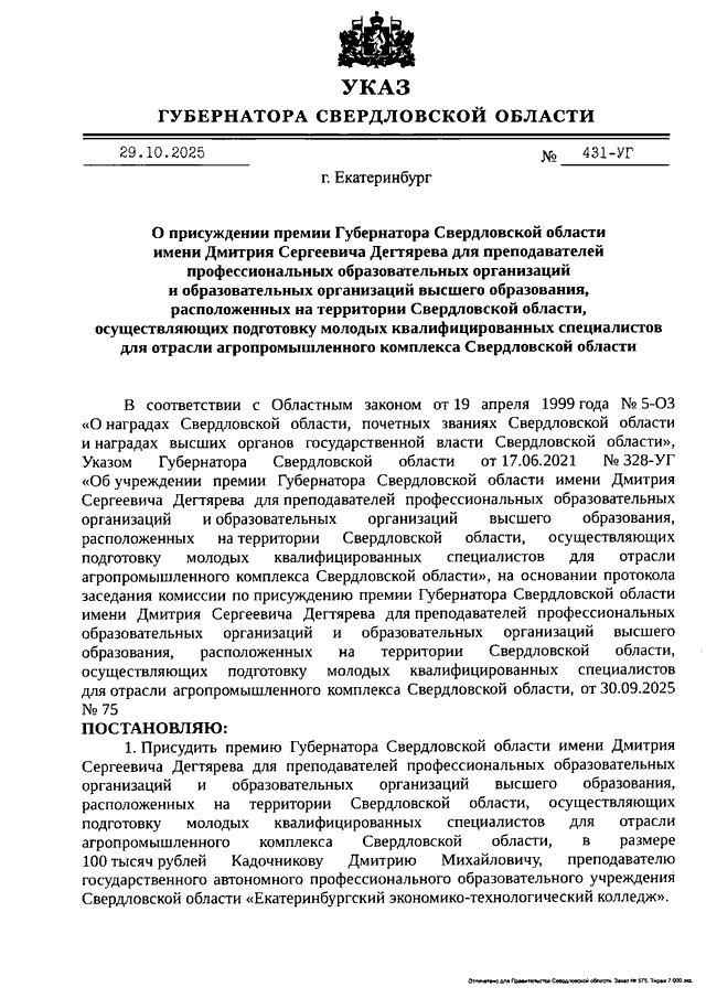 Указ Губернатора Свердловской области от 29.10.2025 N 431-УГ "О присуждении премии Губернатора Свердловской области имени Дмитрия Сергеевича Дегтярева для преподавателей профессиональных образовательных организаций и образовательных организаций высшего образования, расположенных на территории Свердловской области, осуществляющих подготовку молодых квалифицированных специалистов для отрасли агропромышленного комплекса Свердловской области"
