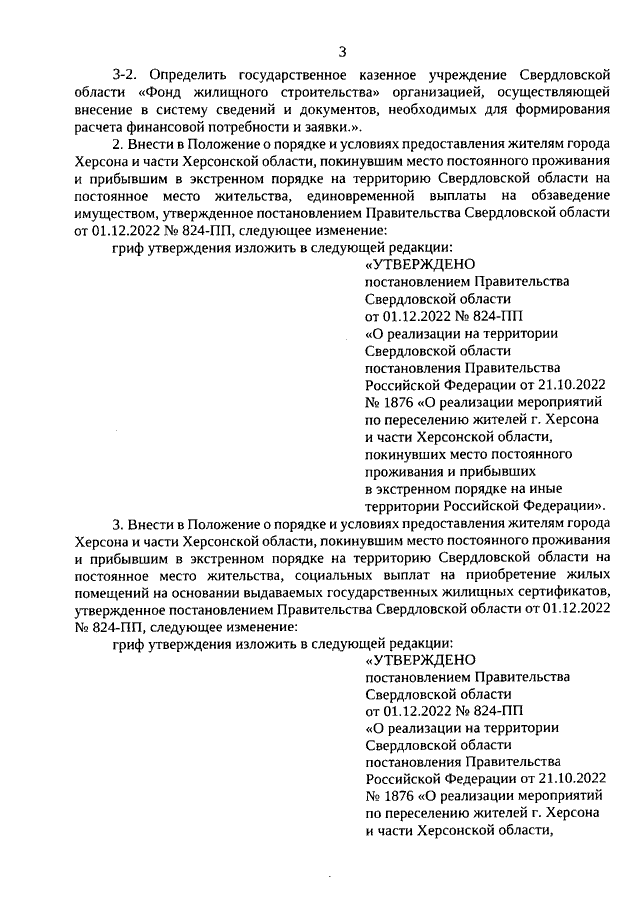 Постановление Правительства Свердловской области от 30.10.2025 N 578-ПП "О внесении изменений в Постановление Правительства Свердловской области от 01.12.2022 N 824-ПП "О мерах социальной поддержки жителей города Херсона и части Херсонской области, покинувших место постоянного проживания и прибывших в экстренном порядке на территорию Свердловской области на постоянное место жительства"