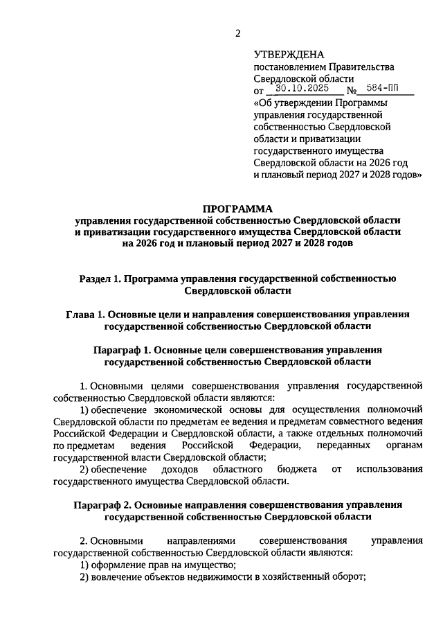 Постановление Правительства Свердловской области от 30.10.2025 N 584-ПП "Об утверждении Программы управления государственной собственностью Свердловской области и приватизации государственного имущества Свердловской области на 2026 год и плановый период 2027 и 2028 годов"