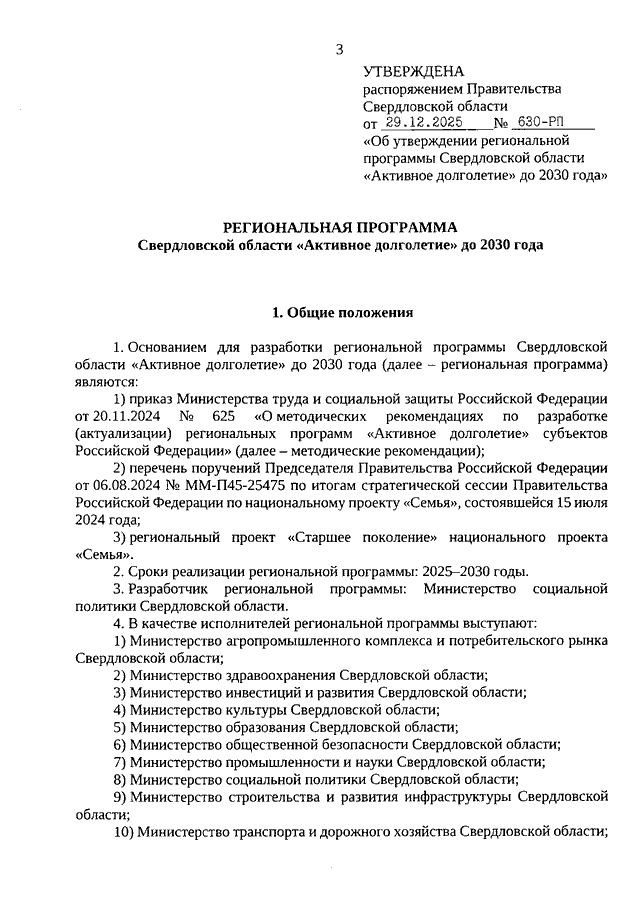 Распоряжение Правительства Свердловской области от 29.12.2025 N 630-РП "Об утверждении региональной программы Свердловской области "Активное долголетие" до 2030 года"