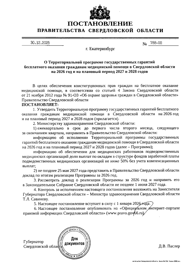 Постановление Правительства Свердловской области от 30.12.2025 N 788-ПП О Территориальной программе государственных гарантий бесплатного оказания гражданам медицинской помощи в Свердловской области на 2026 год и на плановый период 2027 и 2028 годов